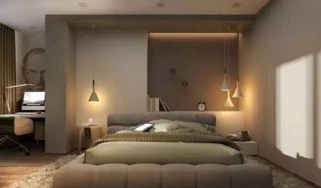 人的視線除了站(zhàn)立平視,更多(duō)的是睡(shuì)前平躺向上(shàng)的,因此在卧室設置分撒、間接、亮度較低(dī)的光(guāng)源,不宜采用光(guāng)線向下(xià)直射的燈具,比如沒有柔光(guāng)燈罩遮擋的吊燈等。