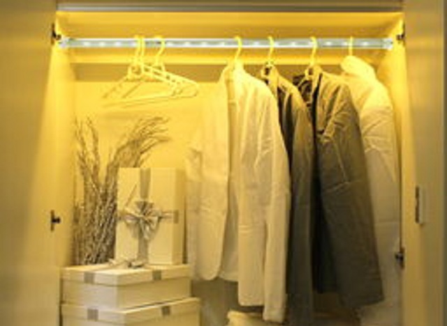 衣櫥内安裝紅(hóng)外感應LED燈,開(kāi)門(mén)亮、關門(mén)滅,方便拿取衣物(wù)。安裝時可以預留電(diàn)線,也可以使用充電(diàn)電(diàn)池。